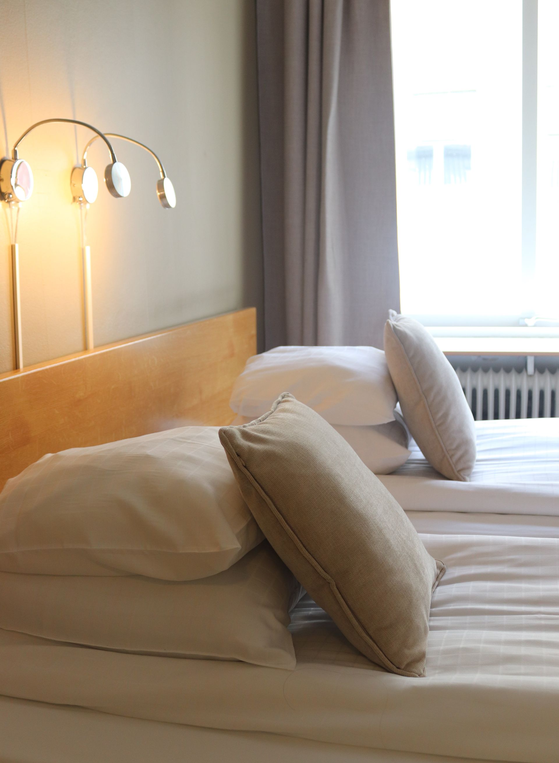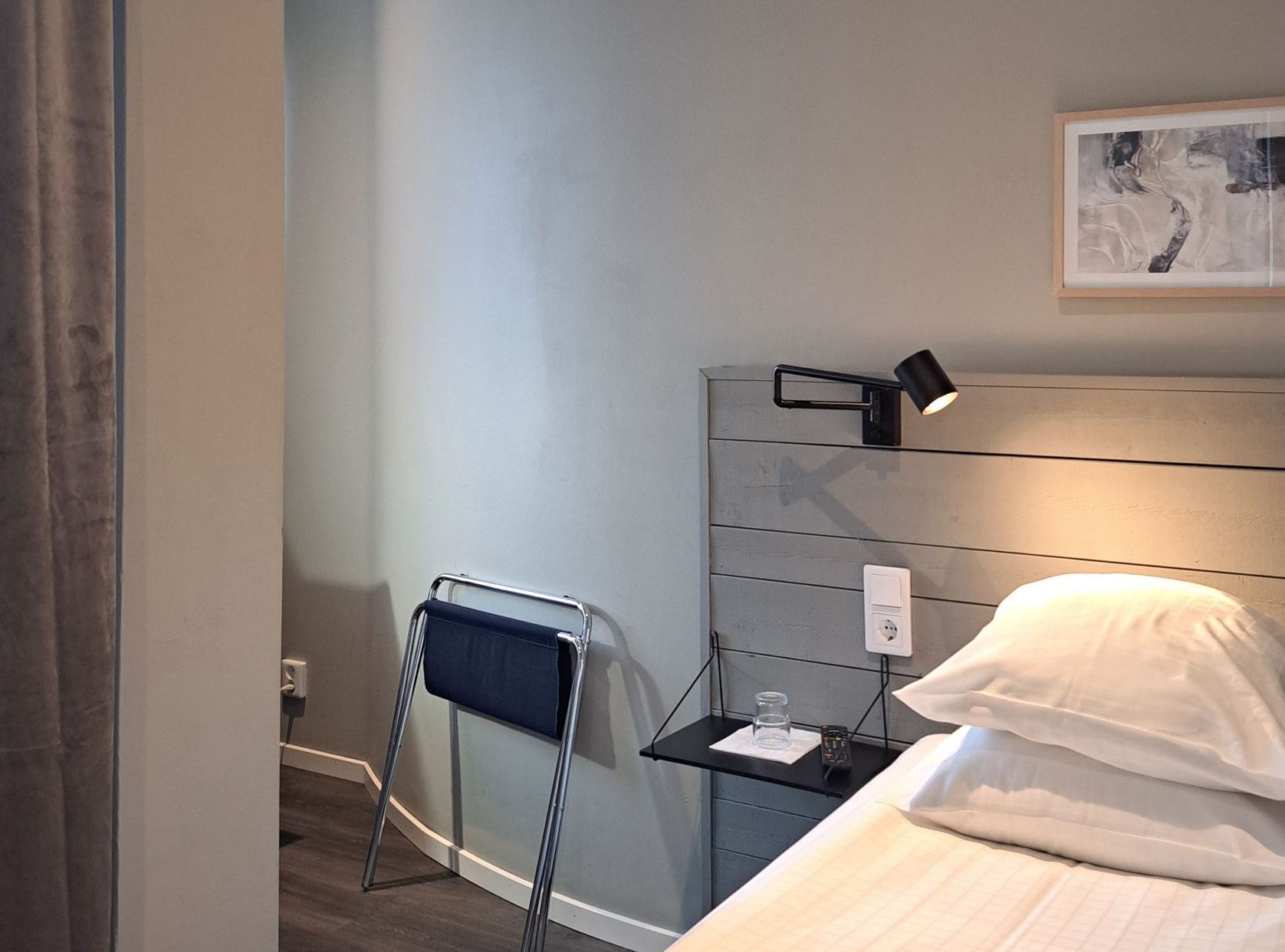 Här får du ett mysigt rum med allt du behöver för en fin vistelse hos oss, en skön säng, skrivbord och en toalett med dusch.