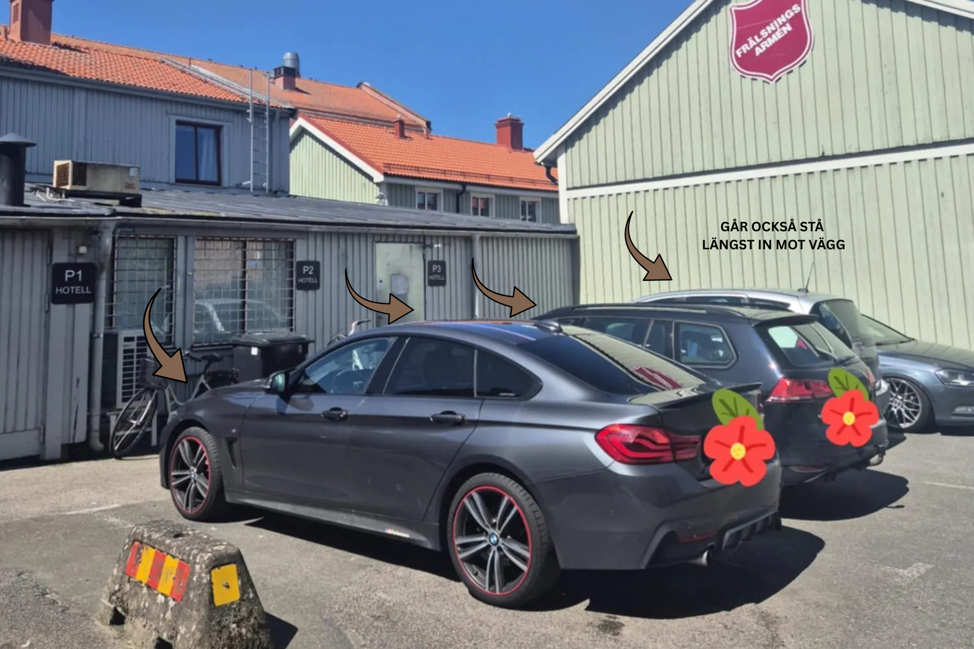 Vi har 3 parkeringsplatser märkta P1, P2 och P3.