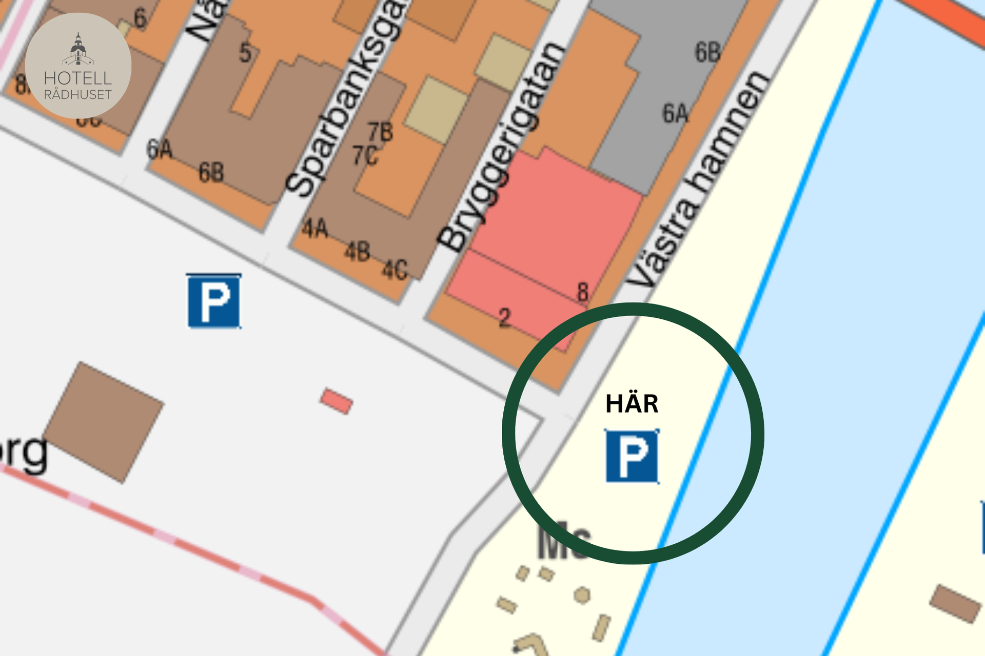 För att komma hit så svänger man in till höger på Nålmakaregatan precis innan vår hotellbyggnad (Mellan hotellet och restaurang Cyrano) tll vänster öppnar det upp sig en parkeringsplats varav våra är markerade.